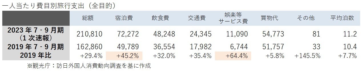 7-9月期の1人あたり費目別旅行支出は、2019年同期比29.4%増の21万円、1-9月期も21万円と政府目標20万円を上回る。