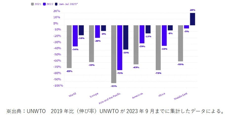 ●UNWTO(国連世界観光機関)の「世界観光指標」では、2023年1月~7月の国際観光客到着数は7億人、2022年同期比で43%増となった。コロナ前の84%(対2019年比16%減)まで順調に回復。