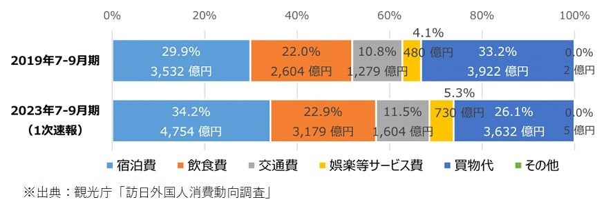 ● 2023年7⁻9月期 訪日外国人旅行消費額(1次速報)は、2019年同期比17.7%増の1兆3,904億円