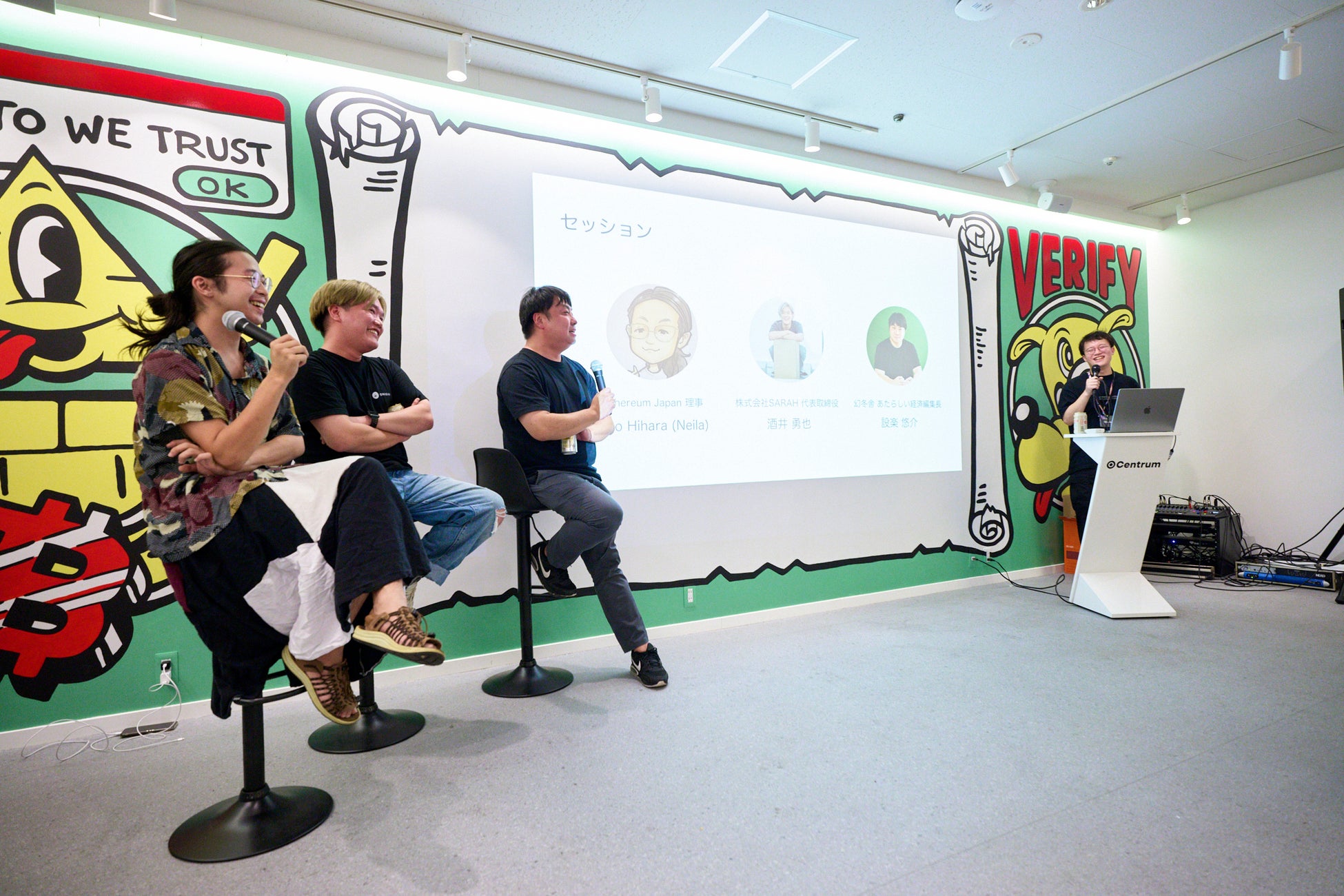 (写真左から)Ethereum Japan理事 Sho Hihara様、株式会社SARAH 代表取締役 酒井勇也様、幻冬舎 あたらしい経済編集長 設楽悠介様、モノバンドル 代表取締役兼CTO/Centrum統括 大畑による、トークセッションを行いました。