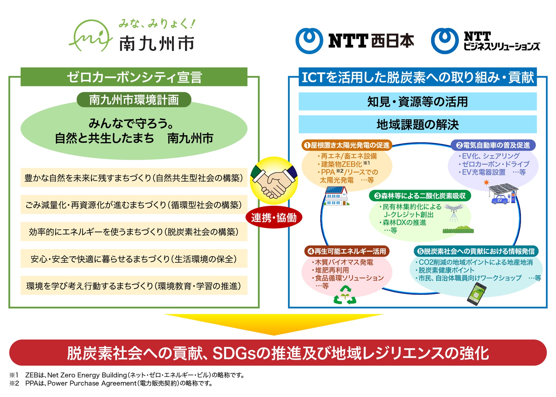 南九州市は、南九州市環境基本計画に掲げる「みんなで守ろう。自然と共生したまち 南九州市」の実現のために、再生可能エネルギーの利活用をはじめとした脱炭素化に向けた各種施策を効果的かつ継続的に推進しています。一方、NTT西日本、NTTBSは、「社会の抱える課題解決に向けたICTソリューションを提案していく企業」として、これまでに培った知見や最新の技術をいかし、自治体の地域活性化の取り組みを支援しています。このような背景のもと、ICTを活用した地域社会の発展に向けて、相互に連携しながら取り組むことについて両者が合意し、今回の南九州市全体の脱炭素社会の実現に向けた連携協定を締結する運びとなりました。