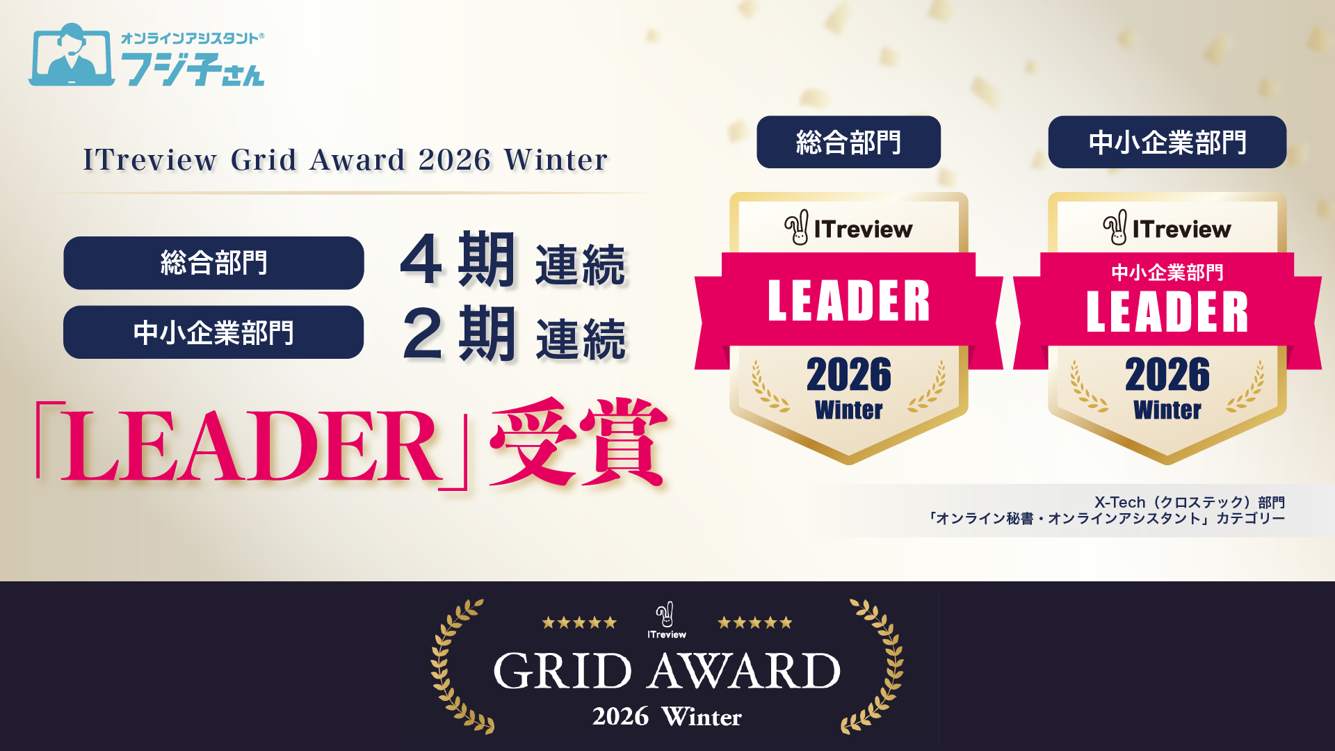 BPOテクノロジー株式会社(本社:東京都中央区、代表取締役社長:山田真也、以下「当社」)が提供するサービス「オンラインアシスタントⓇ「フジ子さん」が「ITreview Grid Award 2026 Winter」の2部門*で最高位の「Leader」を受賞いたしましたのでお知らせいたします。