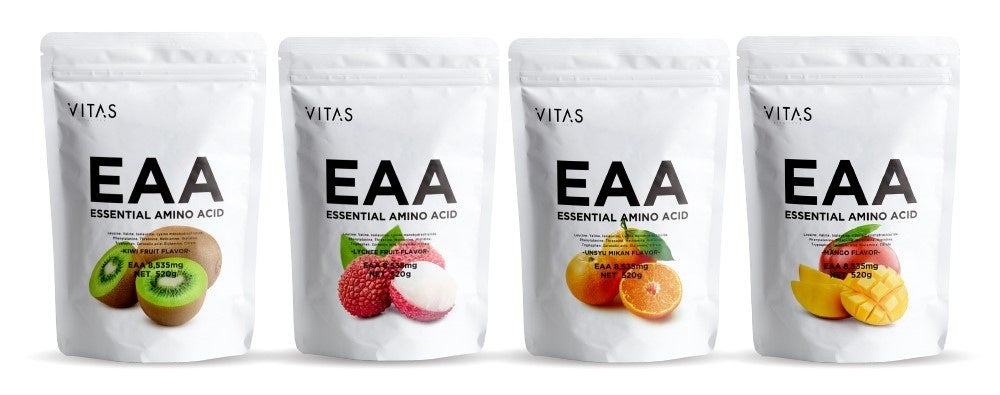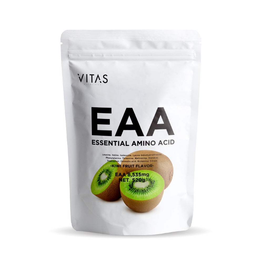 VITAS の「EAA」は、1食あたり EAA(必須アミノ酸)を 8,535mg 配合!プロテインに比べて吸収が早いため、トレーニングの前や最中に飲むことで効率よく筋合成、筋肉回復が見込めます。