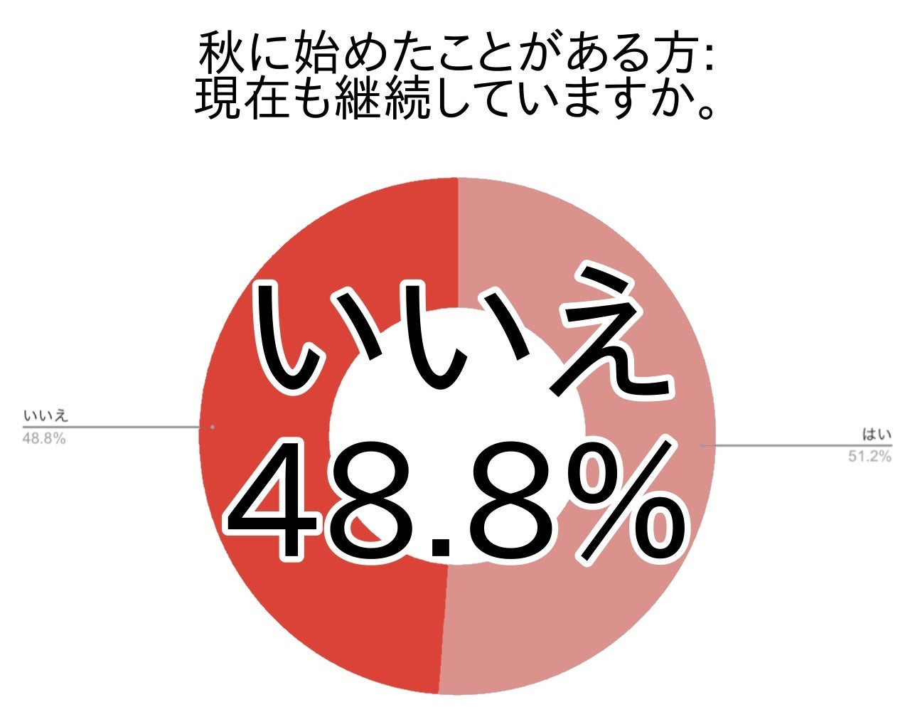 今回のアンケートでは、秋に何かを始めたことがある方で現在は継続できていないと答えた方は関東・全国ともに5割弱(関東48.8%・全国46.4%)でした。楽しんで始めても残念ながら継続ができていない方が約半数いることが分かりました。
