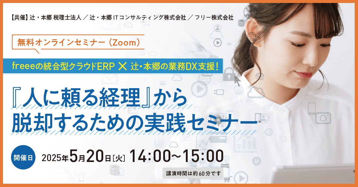 辻・本郷 税理士法人(本社:東京都新宿区、理事長:桑木小恵子)と、フリー株式会社(本社:東京都品川区、代表取締役社長:佐々木大輔)と共催で、2025年5月20日(火)に「freeeの統合型クラウドERP × 辻・本郷の業務DX支援!~『人に頼る経理』から脱却するための実践セミナー~」を開催いたします。