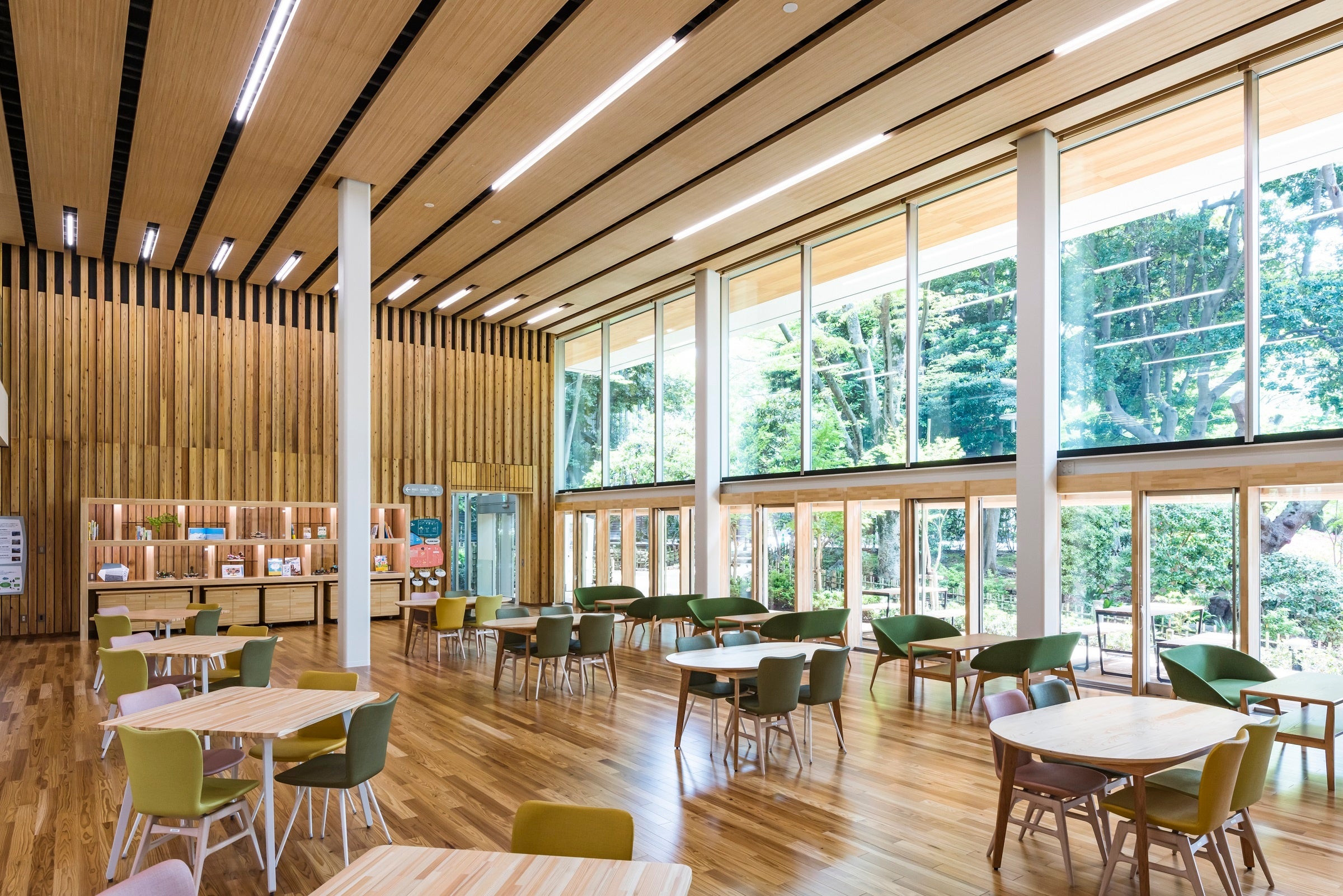 施設内には自由に過ごせる憩いや交流の場として「コミュニティラウンジ」も設置しています。内装材は、区と交流・連携のある自治体の木材を多用し、緑豊かな眺望と相まって、安らぎとくつろぎの場を形成。外観は、戸越公園内の樹木を活かしながら、隣接する公園の門から連続する構成とし、また建物の高さを抑えることで公園全体との調和を図っています。