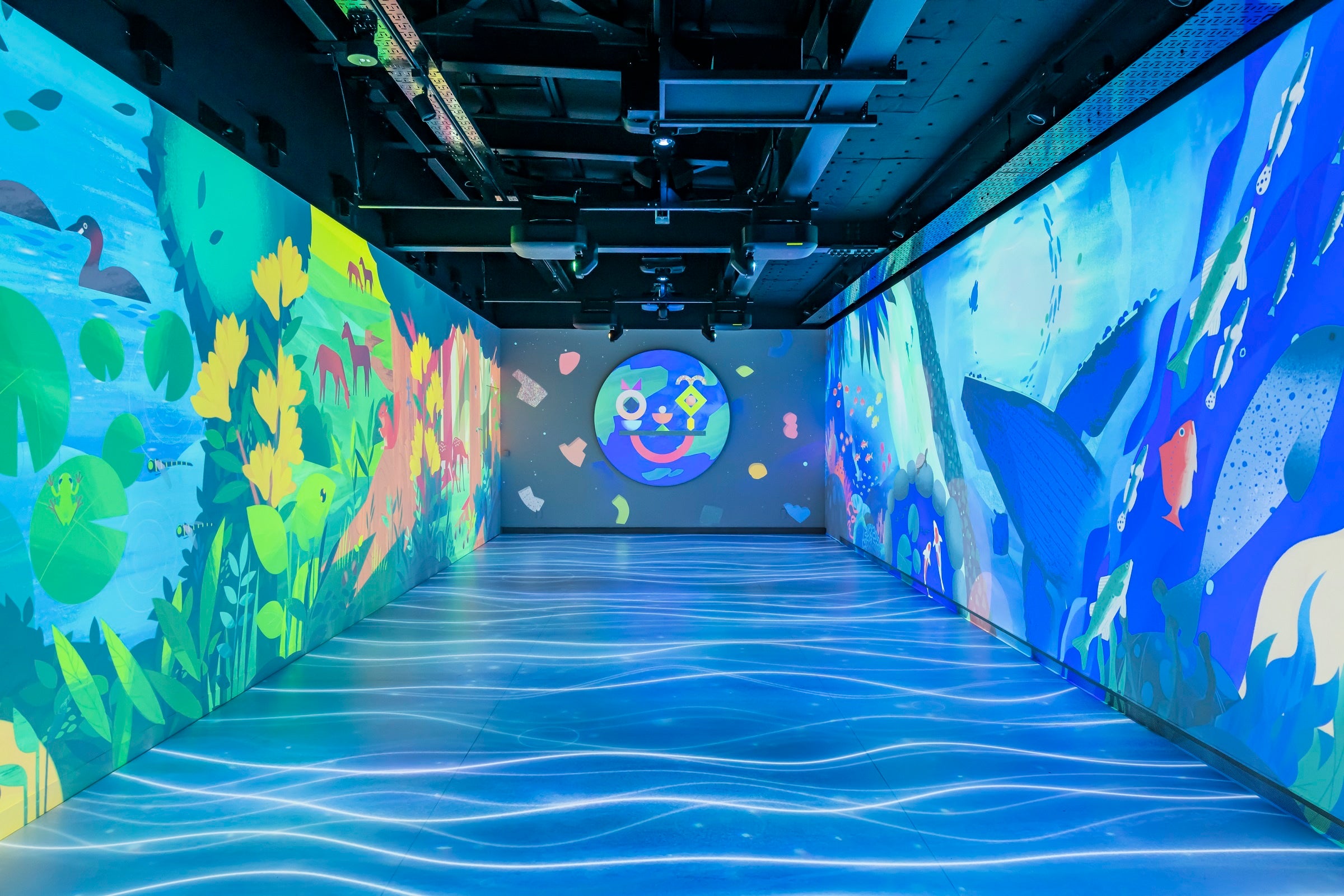 施設の第一ターゲットは「未来をつくる子どもたち」。自ら環境に関心を持ち行動する心の芽生えにつながるよう、体感を重視した環境学習展示や、その下支えとなる建築物を計画。展示物としては、日常の暮らしと自然環境とのかかわりをダイナミックな映像によって疑似体験できる「大型映像展示」などを設置しました。