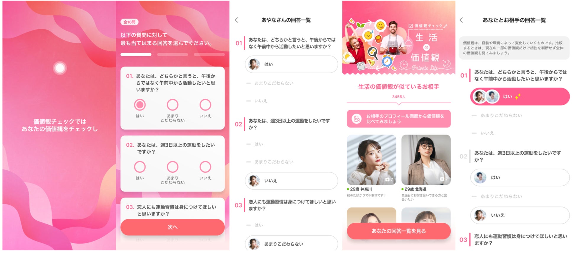この度、3月11日(月)から価値観診断「価値観チェック」に、既存の「コミュニケーションの価値観」に加えて、「人間関係の価値観」「生活の価値観」「仕事の価値観」の3つを新たに提供開始いたします。「人間関係の価値観」では家族・友人や上下関係について、「生活の価値観」では生活習慣や趣味・お金などの価値観について、「仕事の価値観」ではワークライフバランスやキャリアプランについての価値観を知ることができます。「価値観チェック」では、これまでマッチング後に話すことでしか知ることができなかったお相手の価値観についても、マッチング前に知ることができるようになり、より価値観を重視した恋活を行えるようになります。