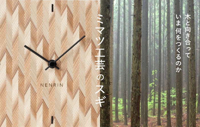 20数年前から作りはじめたのは、1本のスギの年輪をそのままに丸太から作った年輪時計。そこから試行錯誤を続け、生み出されたのが、現在の1本のスギの木から一つの製品を作る「一木寄美(いちもくよせび)」のNENRIN時計。その過程で、出会うことになったスギの木目の美しさと、それを活かすための思考を続けるものづくり。そして、あることをきっかけに国産の、地域の木材に改めて向き合い始め、そこから続いてきたミマツ工芸のものづくりとは、いったい?