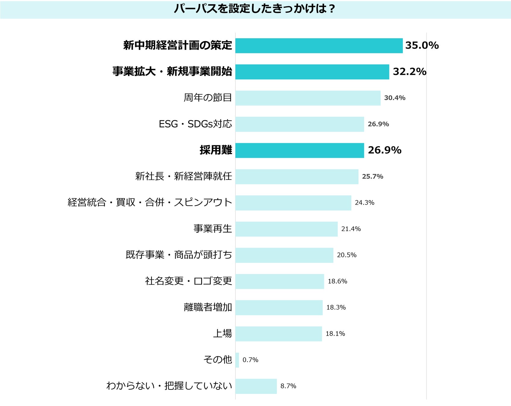 パーパスを設定するきっかけの上位は、「新中期経営計画の策定」や「事業拡大・新規事業開始」という企業の大きな節目ですが、「採用難」をきっかけとしてパーパスを設定する企業が27%いることもわかりました。