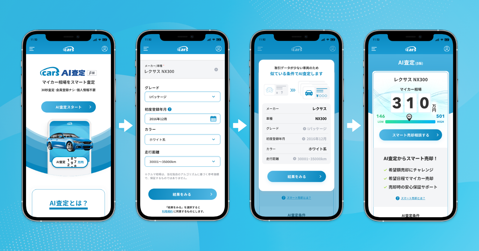 マイカー相場をAIがスマート査定するcarsの「AI査定」が導線をアップデート。査定入力においてデータベースに登録がない理由で表示できなかった結果を、算出可能な条件をAIが提案。そのまま結果を表示させれば、希望していた条件に近似したマイカー条件の小売相場を参照が可能です。これにより、従来、結果不算出により閉ざされていた導線が改善され、以前よりも手軽にマイカーの相場を把握することができ、売却時期を把握しやすくなりました。