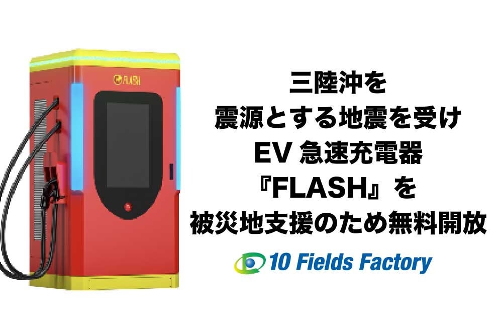 テンフィールズファクトリー株式会社(本社:京都府相楽郡精華町、代表取締役:市川 裕、以下「当社」)は、2026年4月20日に発生した三陸沖を震源とする最大震度5強の地震(マグニチュード7.7)を受け、被災地域の電力インフラ支援を目的として、北海道および岩手県に設置しているEV急速充電器『FLASH』5拠点を同日より無料開放いたしました。