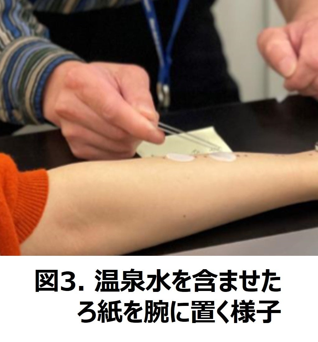 41℃の温泉水または精製水をろ紙に含ませ、腕に10分間置いた(図3)後、角層細胞を粘着テープで採取し染色・観察しました。肌のうるおい力や保護力との関連が分かっている「角層細胞のはがれ具合・大きさ・形」をもとに温泉の作用を判定しました。