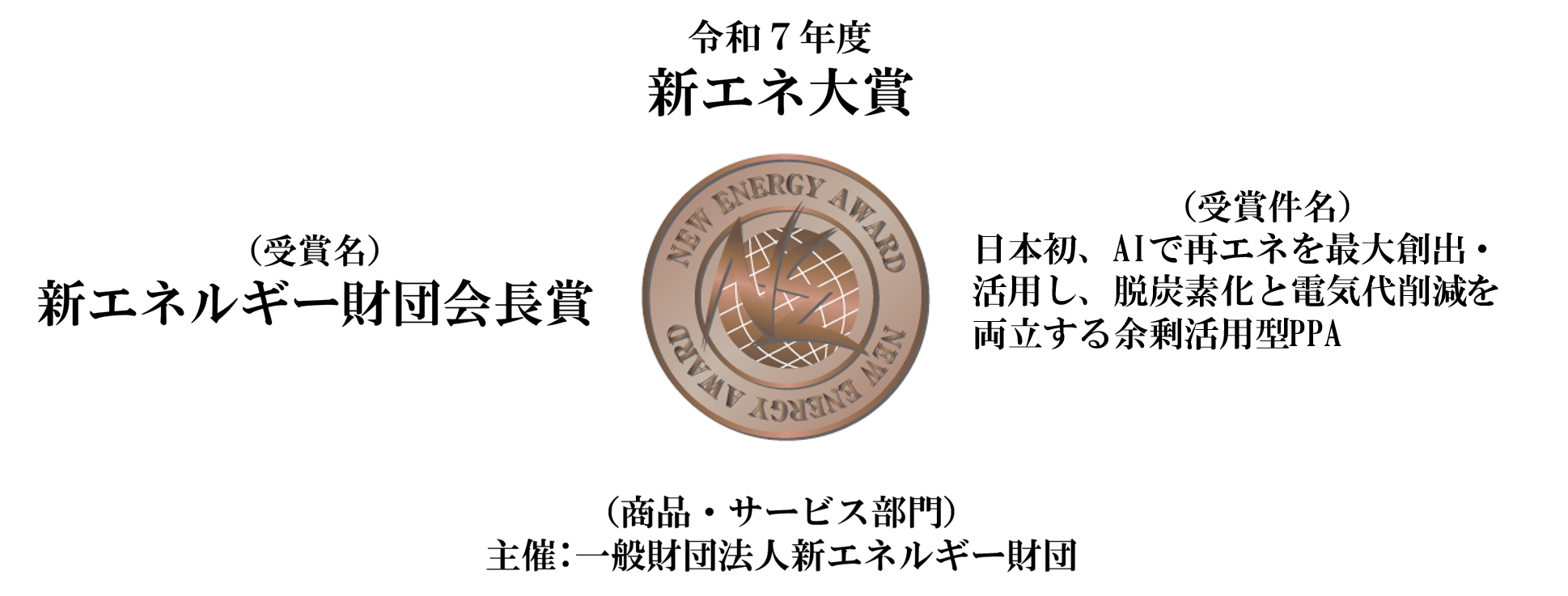 株式会社Sustech(東京都港区、代表取締役:丹野裕介・飯田祐一郎/以下、Sustech)は、一般財団法人 新エネルギー財団が主催する「令和7年度新エネ大賞」において、「新エネルギー財団会長賞」(商品・サービス部門)および「ベンチャー企業特別賞」を受賞いたしましたことをご報告させていただきます。当社が提供する「AIを活用し、再生可能エネルギーの最大創出・最大活用を実現する“余剰電力活用型コーポレートPPA”」が、日本の再エネ導入拡大と脱炭素社会の実現に大きく貢献する先進性と独創性を高く評価されたものです。