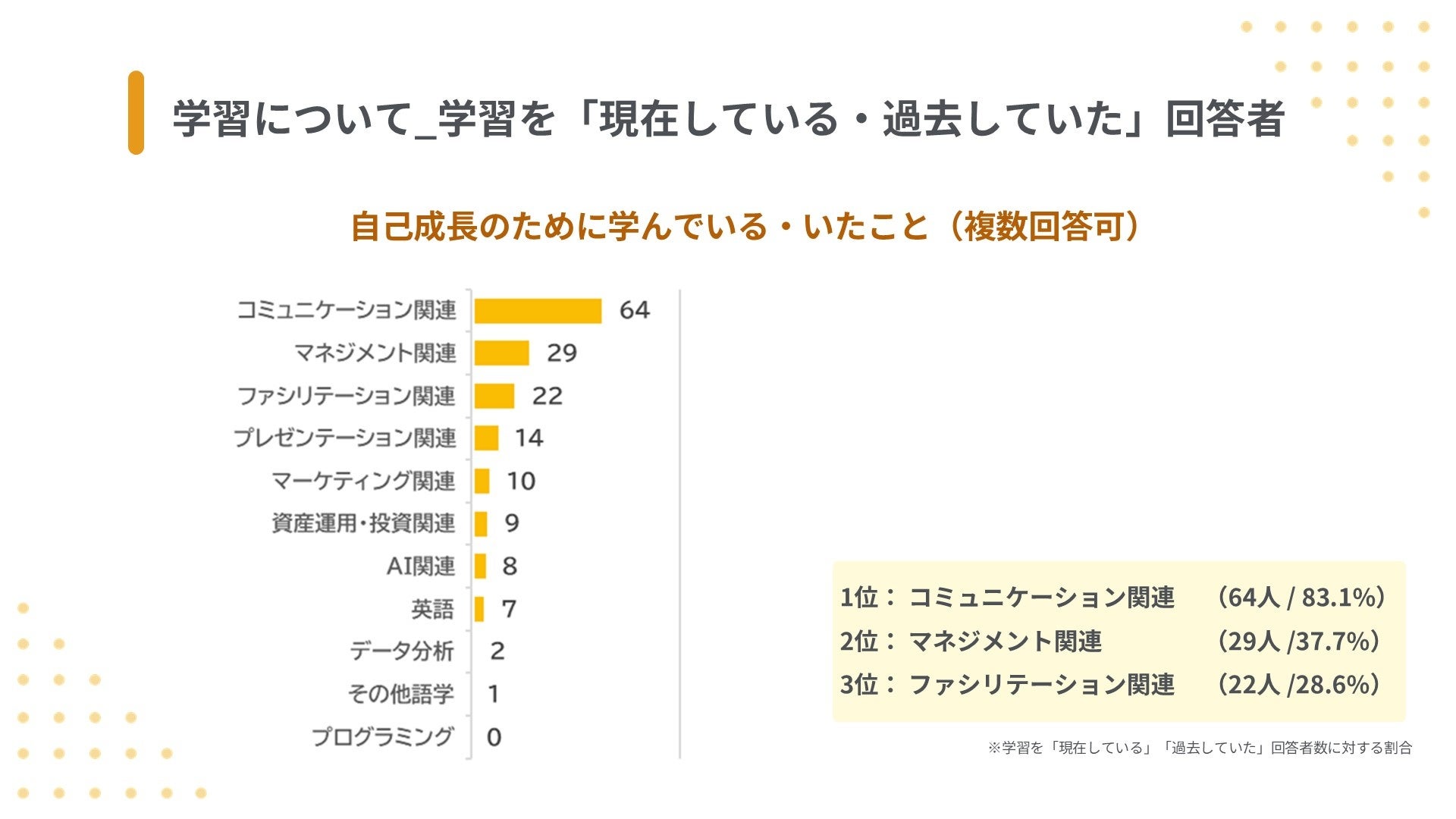 「自己研鑽やスキルアップのための学習を現在している・過去していた」と回答した方に「自己成長としてどんなことを学んでいる・いたか(複数回答)」(n=77)と質問したところ、「コミュニケーション関連」が83.1%、「マネジメント関連」が37.7%という回答となりました。