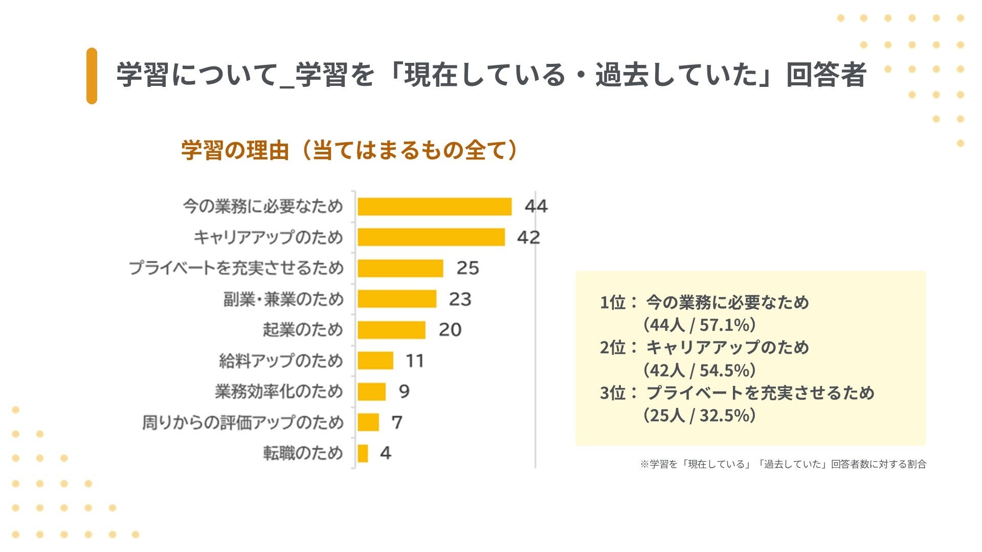 上記質問で「自己研鑽やスキルアップのための学習を現在している・過去していた」と回答した方に「なぜ自己研鑽やスキルアップのための学習をしている・していたのでしょうか(複数回答)」(n=77)と質問したところ、「今の業務に必要なため」が57.1%、「キャリアアップのため」が54.5%と半数以上、「プライベートを充実させるため」が32.5%という回答となりました。