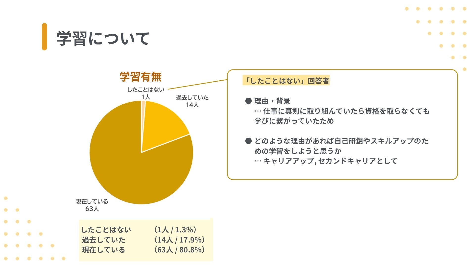 自己研鑽やスキルアップのための学習をしたことがない回答者は、「仕事に取り組んでいたら資格取得などの勉強をしなくても学びに繋がっていたが、キャリアアップやセカンドキャリアに繋がるのであれば学んでみたい」と回答しています。