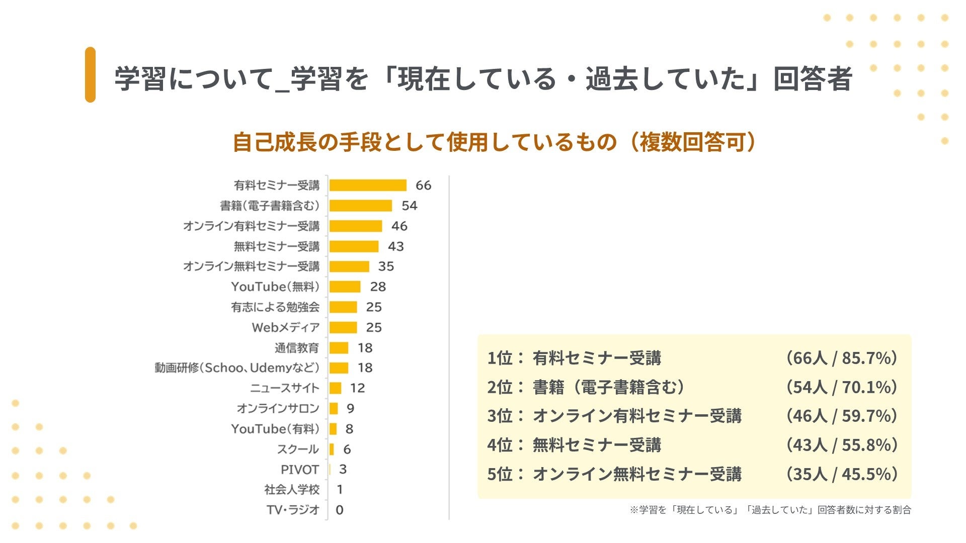 「自己研鑽やスキルアップのための学習を現在している・過去していた」と回答した方に「自己成長の手段として使っているもの(複数回答)」(n=77)と質問したところ、「有料セミナー受講」が85.7%、「書籍(電子書籍含む)」が70.1%、「オンライン有料セミナー受講」が59.7%という回答となりました。