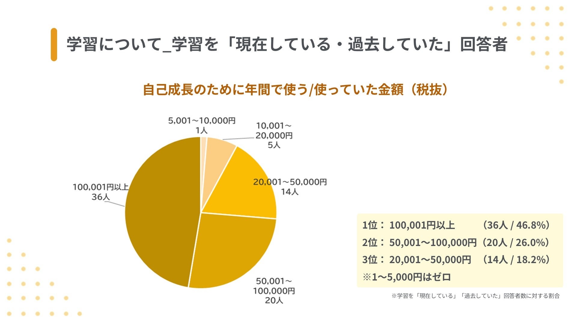 「自己研鑽やスキルアップのための学習を現在している・過去していた」と回答した方に「自己研鑽やリスキリングなど、自己成長のために使っている・使った金額(税抜)」(n=77)を質問したところ、10万円より高い金額が46.8%の回答でした。