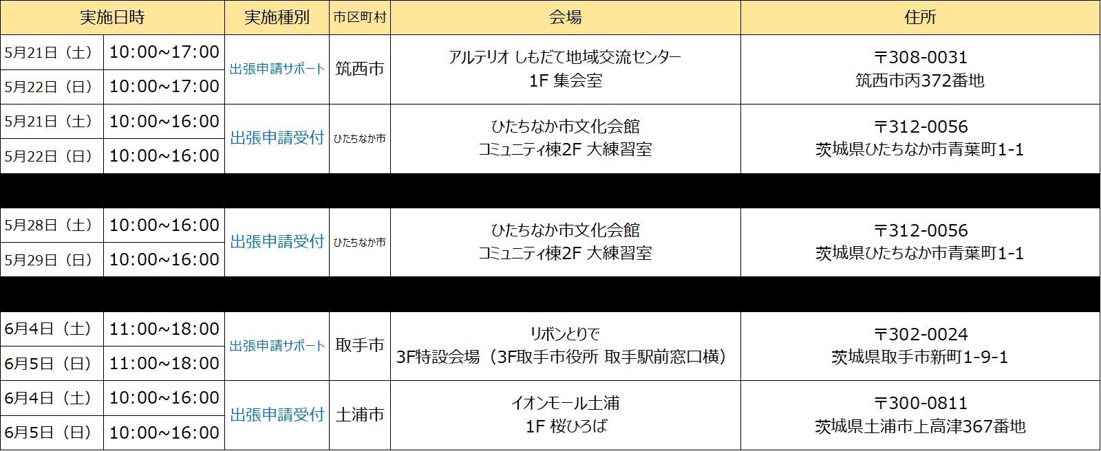 ※開催場所の調整状況や新型コロナウィルスの感染状況等により、「出張申請受付」及び「出張申請サポート」の開催を中止・延期、または実施内容が変更となる可能性がございます。