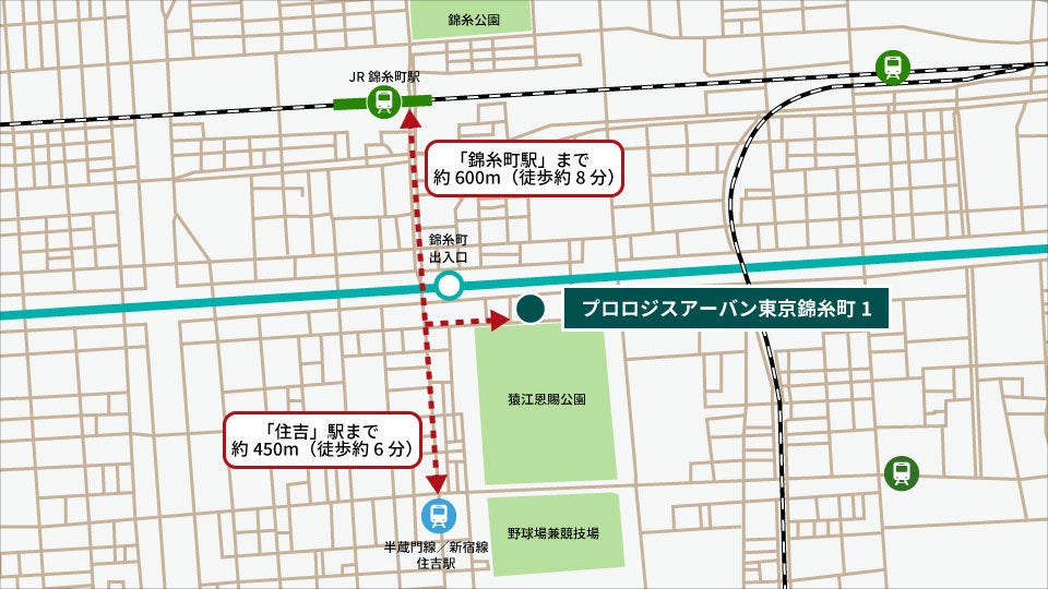 開発地は、東京駅から約4.6kmと、2020年提供開始の「プロロジスアーバン」シリーズのなかで東京の中心地に最も近い立地です。JR総武線「錦糸町」駅から約600m(徒歩約8分)、東京メトロ半蔵門線・都営新宿線「住吉」駅から約450m(徒歩約6分)で、通勤利便性が高く、周辺には多くのオフィスが隣接しています。