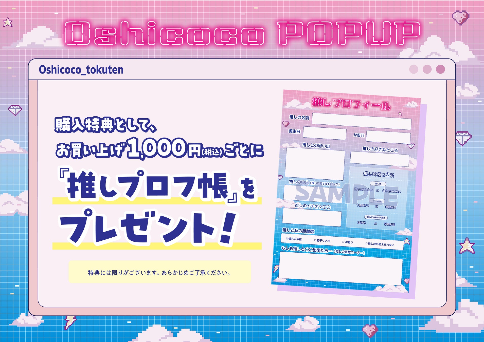 1000円(税込)ごとのご購入で、本イベント限定「推しプロフ帳」をプレゼント。推しにまつわるプロフィールを書き込むことができるカードとなっています。