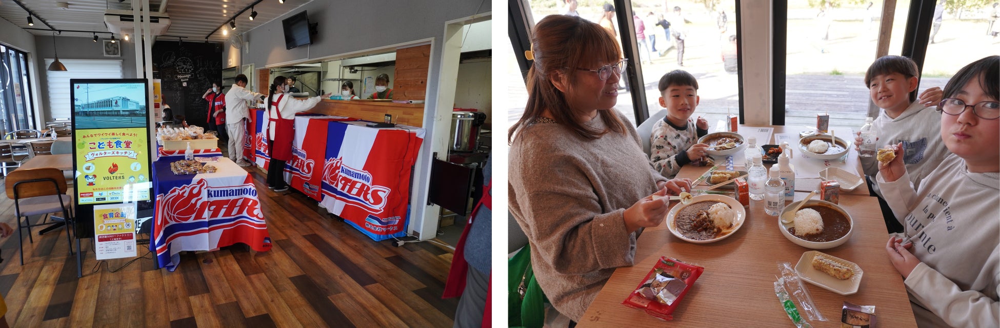 その一環として、熊本ヴォルターズが運営する子ども食堂「VOLTERS KITCHEN(ヴォルターズキッチン)」に、食材として使用するお米の寄付を2023年から行っており、今年は「水田オーナー制度」で10月に収穫した新米を11月に寄付しました。そのお米を使って作られたカレーライスが、11月17日(日)と12月7日(土)に開催されたヴォルターズキッチンで延べ200名以上の子どもたちとその家族にふるまわれました。