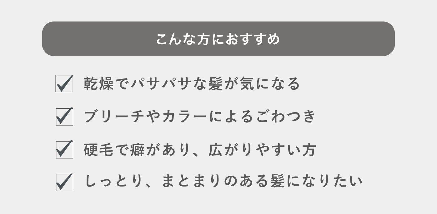 ダメージによるパサつきや広がり、うねりが気になる方、しっとりまとまる仕上がりを求める方におすすめです。