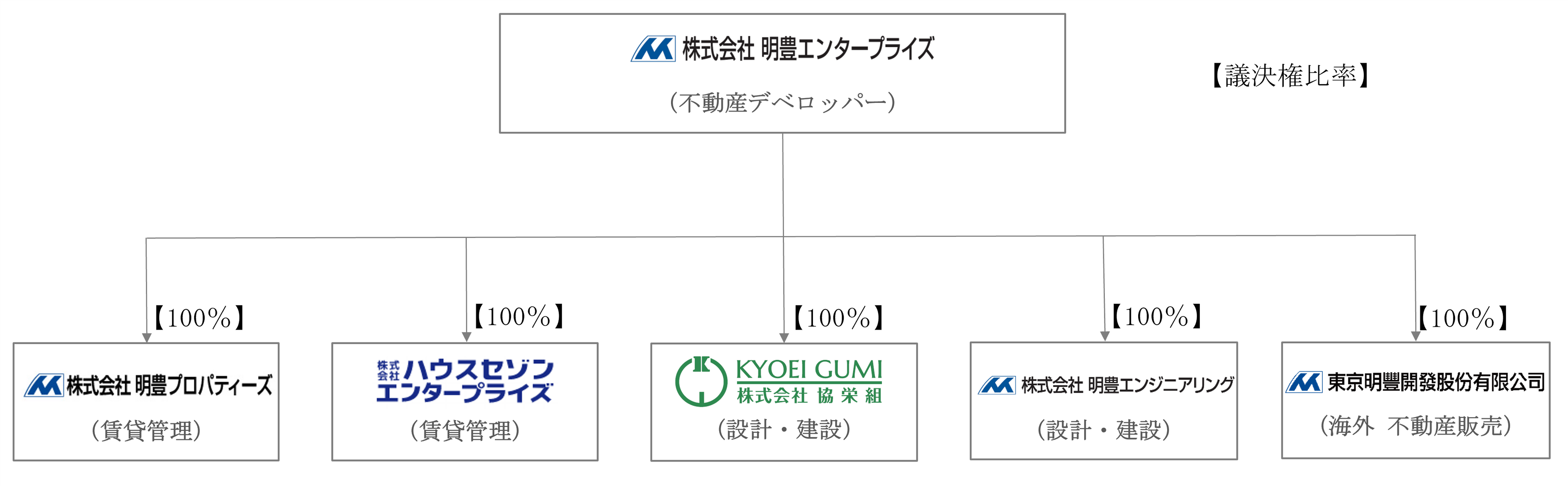 創業57年、物造りにこだわった信頼と実績の東証上場デベロッパーとして、東京23区を中心に250棟を超える“新築1棟投資用賃貸住宅”を供給している株式会社明豊エンタープライズ(東京都目黒区:代表取締役会長 矢吹 満)を親会社とし、賃貸管理会社の株式会社明豊プロパティーズ(東京都目黒区:代表取締役社長 竹内 智大)、株式会社ハウスセゾンエンタープライズ(京都府京都市:代表取締役社長 奥山 秀昭)、建設会社の株式会社明豊エンジニアリング(東京都目黒区:代表取締役社長 阪本 伸司)、株式会社協栄組(東京都世田谷区:取締役社長 徳満 亮輔)、海外現地法人の東京明豐開發股份有限公司(本社 台北市中山区:代表取締役社長 内田千博)で構成されております。