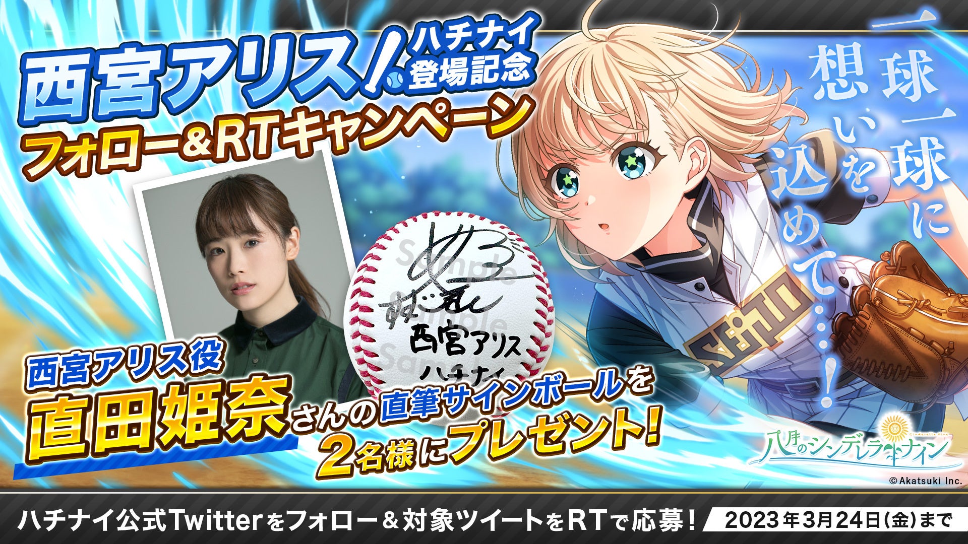 2023年3月20日(月)から2023年3月24日(金)までの5日間、西宮アリスを演じる直田姫奈さんの直筆サインボールをプレゼントするTwitterキャンペーンを開催いたします。