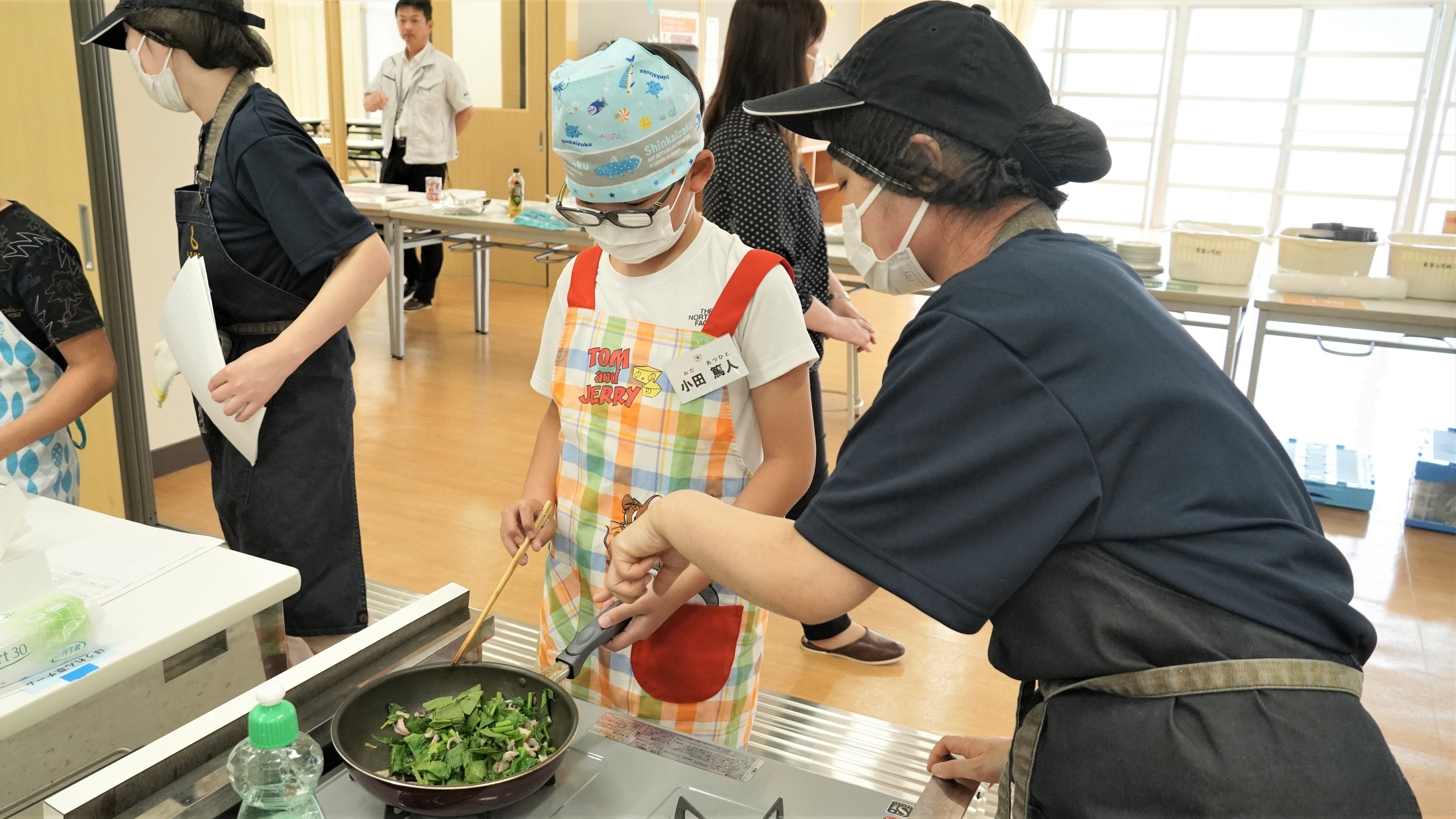 第5回では「地元の食材を使って、メニュー開発しよう!」と題し、7月の授業・夏休みの宿題で考えた献立を実際に試作する調理実習を実施。調理実習では、各チームに1~2名のサポートが付き、児童たちの調理を補助※2。安全・衛生面に配慮し、チームで協力しながら主食・主菜・副菜・汁物を作りました。