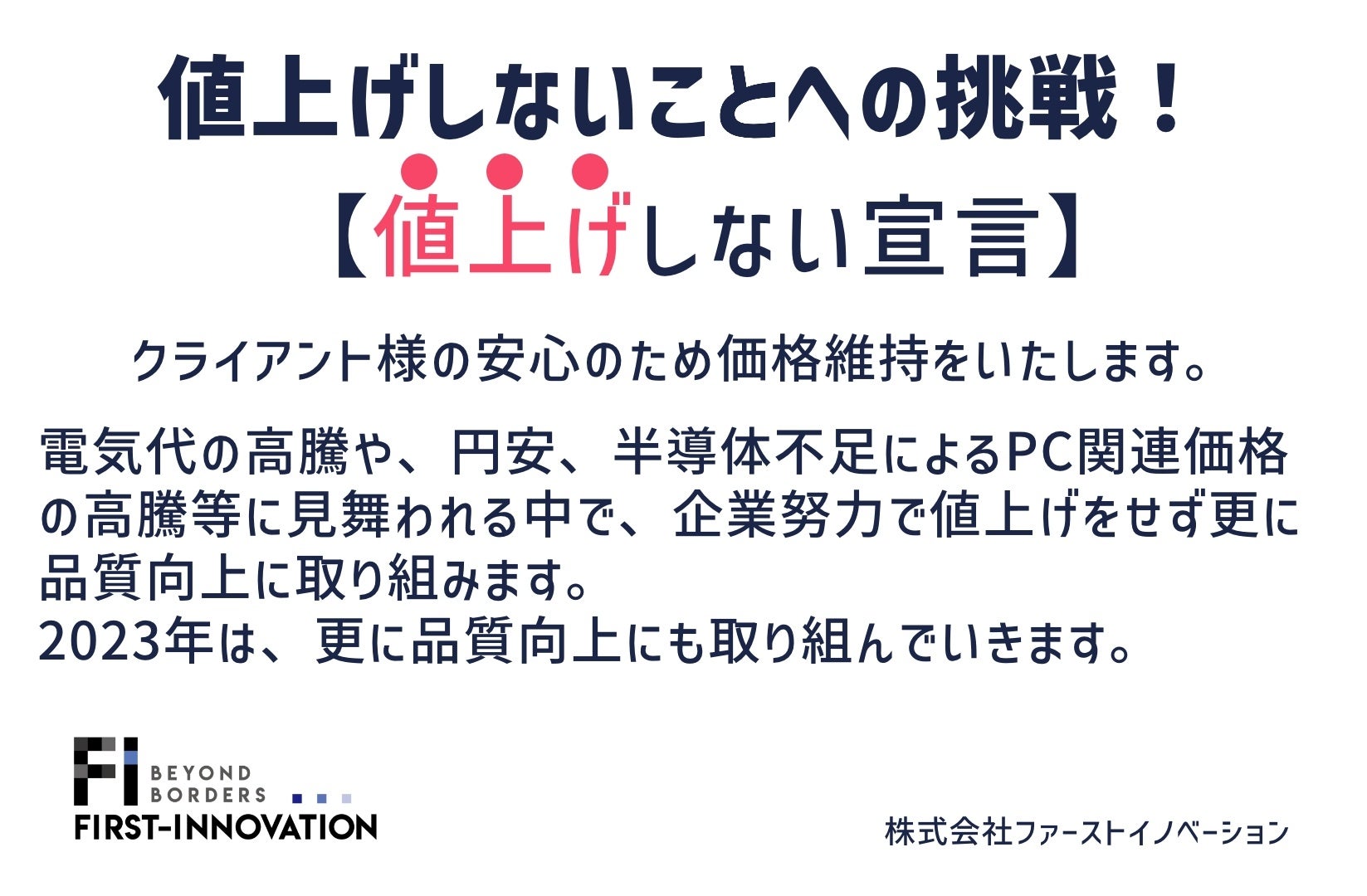 東京都中央区のIT企業『株式会社ファーストイノベーション』(代表取締役社⻑:木ノ根 雄志、以下ファーストイノベーション)は、提供するサービスに関して、2023年【値上げしない宣言】 を発表いたします。