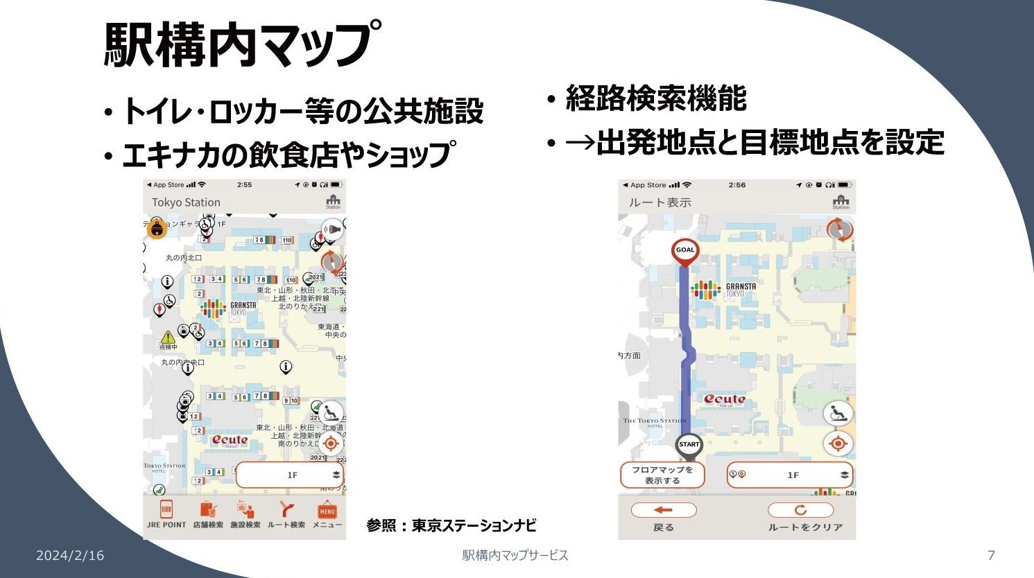 駅の構内マップのデジタル化は一部で進んでいますが、さらなる利便性を求めて、目的地となる改札やお店まで迷わないようなナビ機能や、目的のお店まで行かなくても混雑状況や待ち時間が分かる・予約できるようにすることでエキナカでの過ごし方の満足度向上も目指すものになっています。