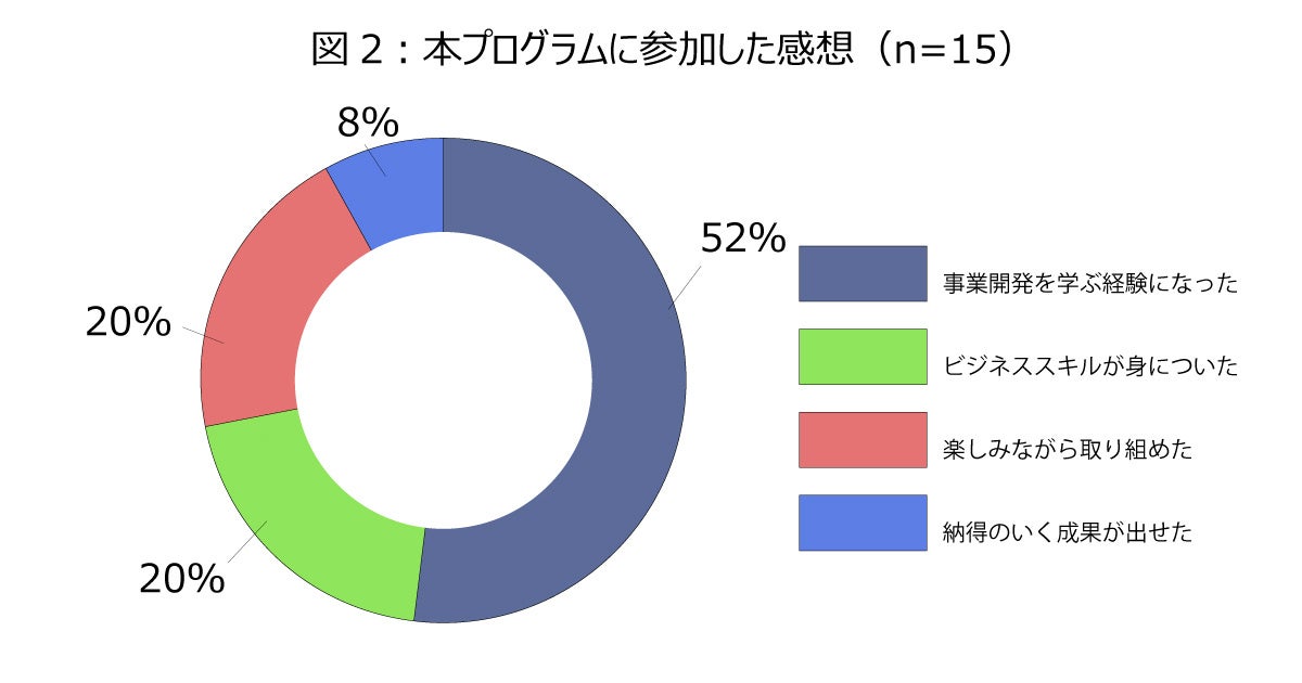 次に本プログラムを終了した時点での感想も伺いました。参加した学生の約半数の方が、「事業開発を学ぶ経験になった」と回答。この他、20%の方からは「ビジネススキルが身についた」という回答がありました(図2)。