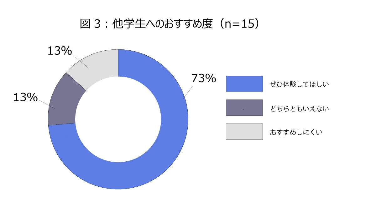 最後に、このプログラムの他学生へのおすすめ度を調査すると、70%以上の学生から「ぜひ体験して欲しい」という声をいただきました(図3)。実際の事業開発に近い体験ができる機会は通常の大学生活ではなかなかなく、学生の皆さんにとっても意義のある経験になったものと思われます。