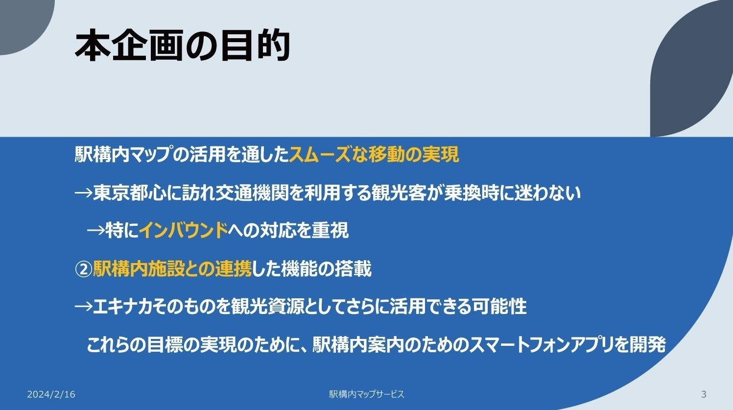 この企画は、地方や海外から観光目的で都心を訪れた際に、東京駅や新宿駅などの大規模ターミナル駅で迷ったこと、結果的にエキナカの施設も楽しめなかったという学生の実体験を元に検討されました。