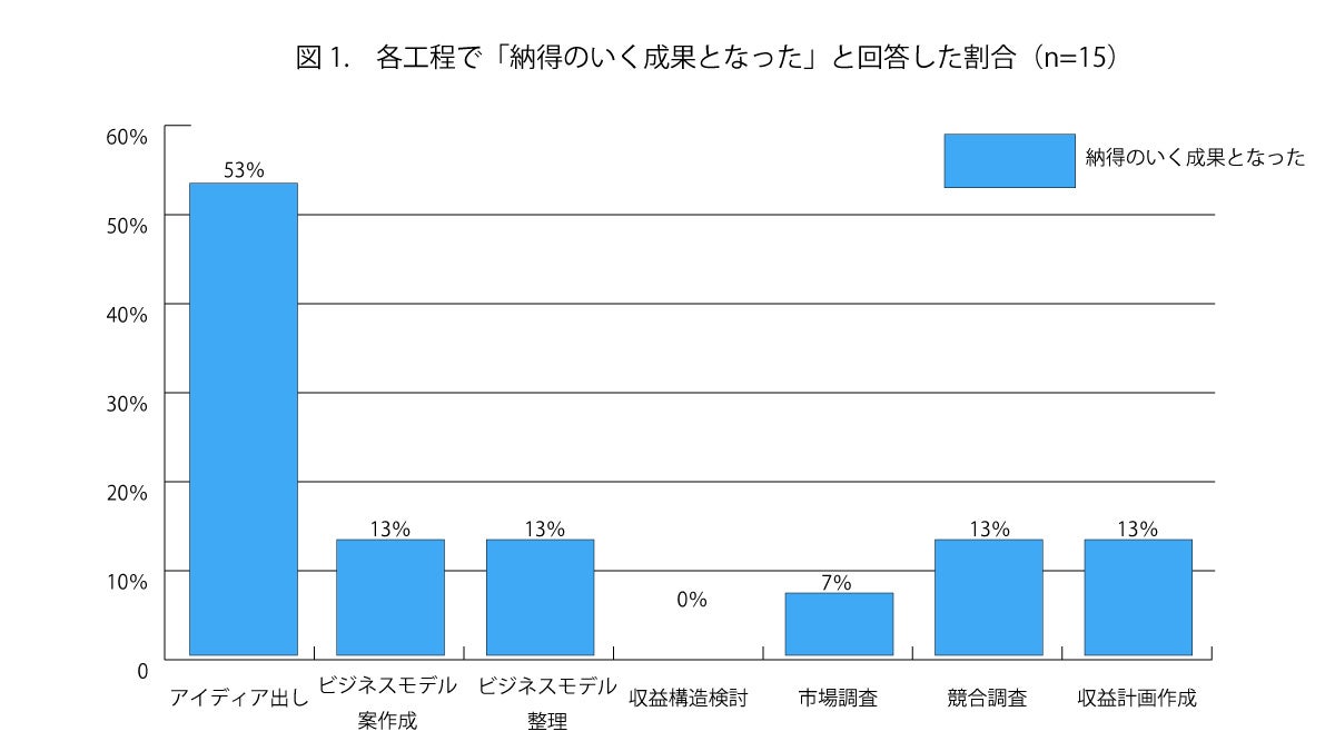 今回のプログラムでは、事業創出のアイディア出しから収益計画作成までの各工程で、グループワークを行い、成果にまとめました。各工程についての感想を調査した結果、「アイディア出し」のように自由な発想を求められる工程では「納得のいく成果となった」という声が多くみられました。一方、事業計画においてリアリティを求められる「収益構造検討」「収益計画作成」などの工程ではスコアが下がる傾向となりました(図1)。