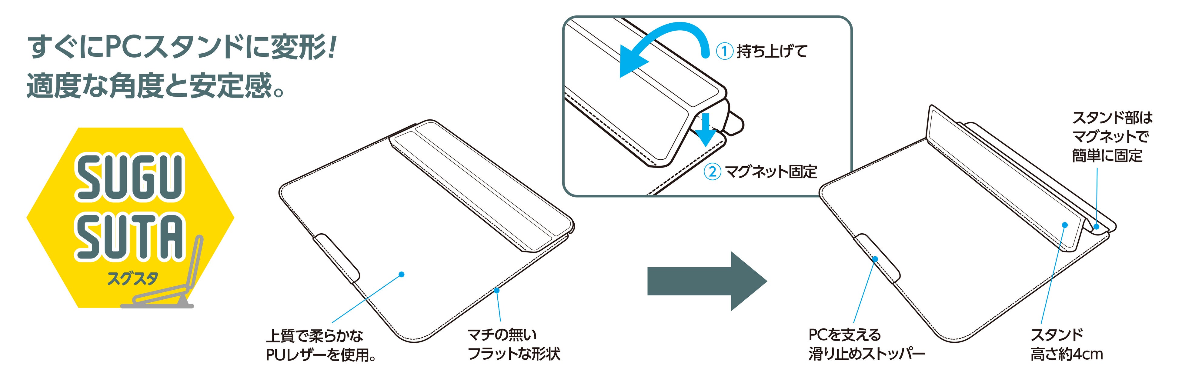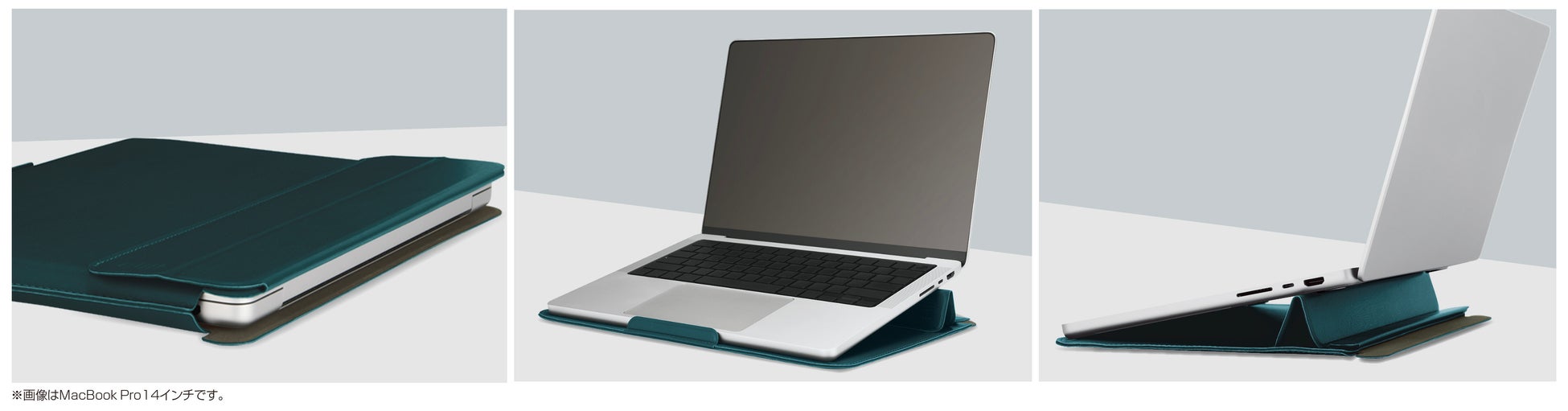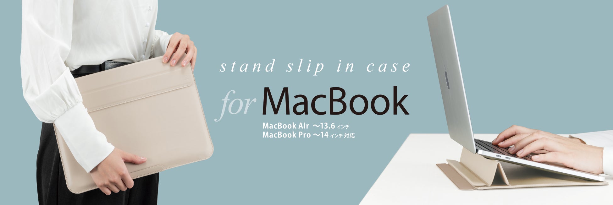 「スタンドスリップインケース」は、PCスタンドに変形するMacBook用インナーケースです。フラップや留め具のないスリップインタイプで、PCの出し入れがスムーズに行えます。ケース側面のパーツを起こしマグネットで固定すると、高さ約4cmのスタンドに変形、PCのキーボードが傾斜し操作時の姿勢改善と、肩や腕にかかる負担を軽減します。PCをしっかり支えるストッパー付きで滑り落ちる心配もありません。ケース本体は約245gの軽量仕様でフリーアドレスや、外出先でPC作業をする社会人や学生に最適です。