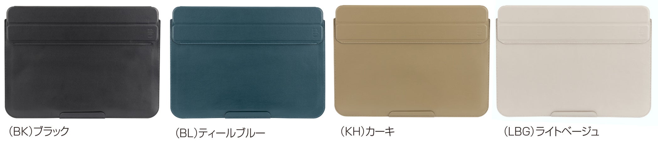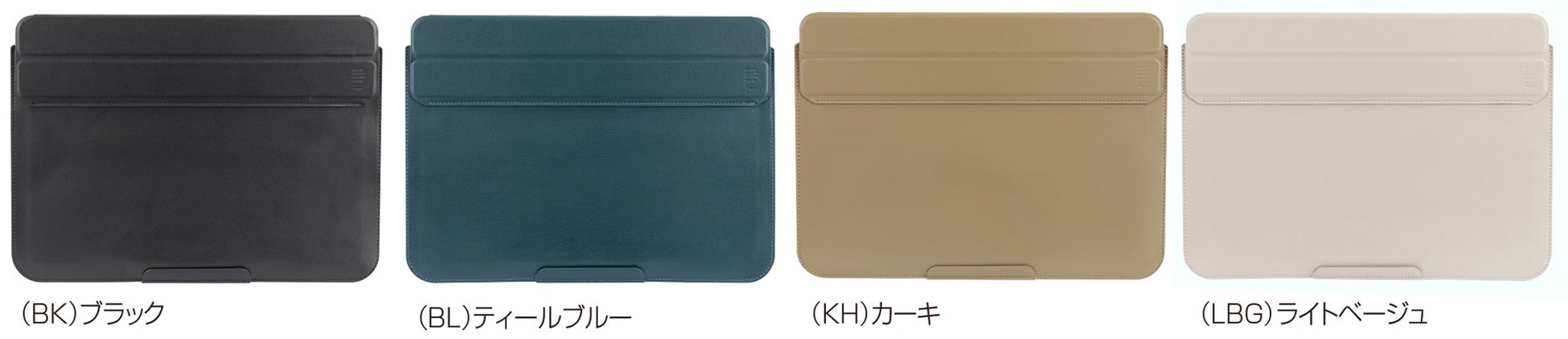 カラーラインアップはブラック(BK)、ティールブルー(BL)、カーキ(KH)、ライトベージュ(LBG)の4色展開です。落ちついた色合いでシンプルなデザインのためシーンを問わずご使用いただけます。外側の素材は上質で柔らかなPUレザー、内側は本体を傷つけにくいソフトで優しい感触のスエード調素材です。