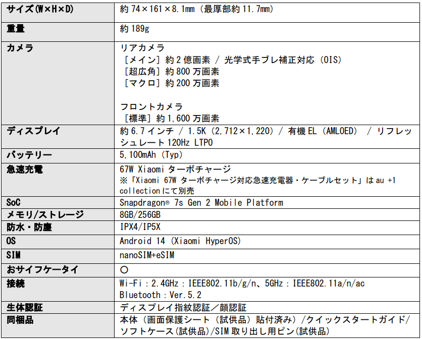 特典内容:67W Xiaomi ターボチャージ対応急速充電器・ケーブルセット