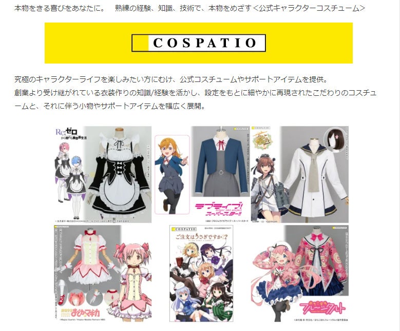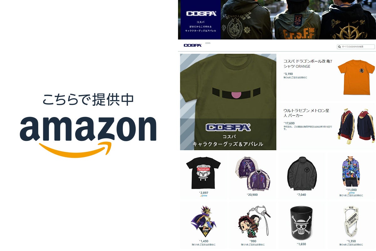 コスパオフィシャルショップ『COSPA Amazon』では、公式キャラクターアパレル/グッズブランド「COSPA(コスパ)」「二次元コスパ」商品をはじめ、これまで自社ECサイトおよび限られた一部店舗でのみ販売をおこなっていた公式キャラクター衣装ブランド「COSPATIO(コスパティオ)」商品をラインナップいたしました。