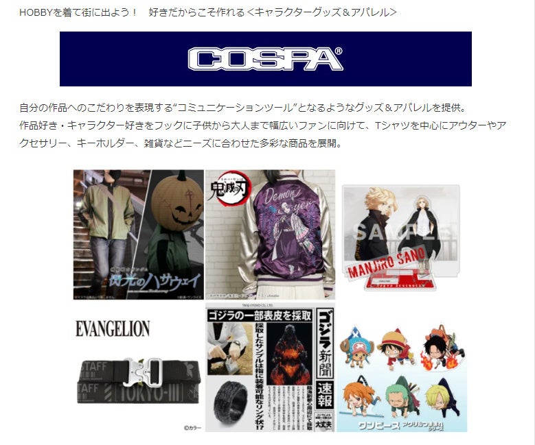 <キャラクター・コミュニケーションで世界をHappyに!>をテーマに掲げ、作品愛を表現できる商品・ファン同士のコミュニケーションツールになる商品など、作品やキャラクターが好きだからこそ作れる商品展開をおこなう株式会社コスパは、『COSPA Amazon』のオープンで、選べる購入場所を増やし、より手軽に購入頂けるようにすることで皆さんのファン活動、キャラクターライフの充実を応援していきます。