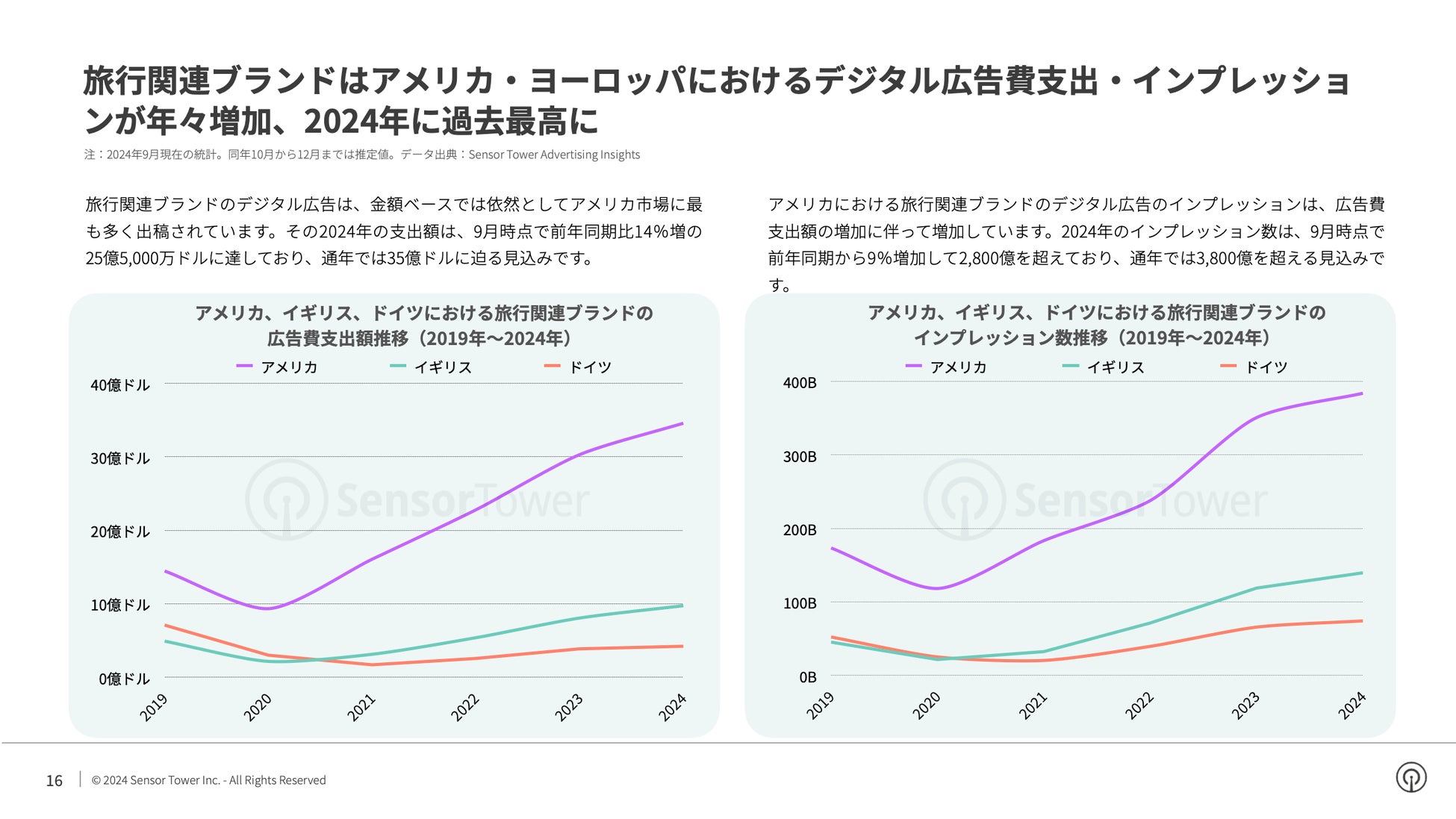 旅行関連ブランドのデジタル広告は、金額ベースでは依然としてアメリカ市場に最も多く出稿されています。2024年の支出額は、9月時点で前年同期比14%増の25億5,000万ドルに達しており、通年では35億ドルに迫る見込みです。