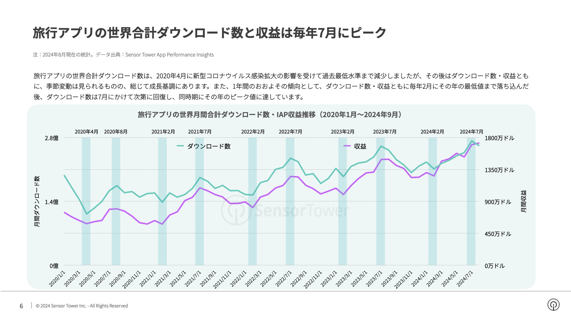 旅行アプリの世界合計ダウンロード数と収益は毎年7月にピーク