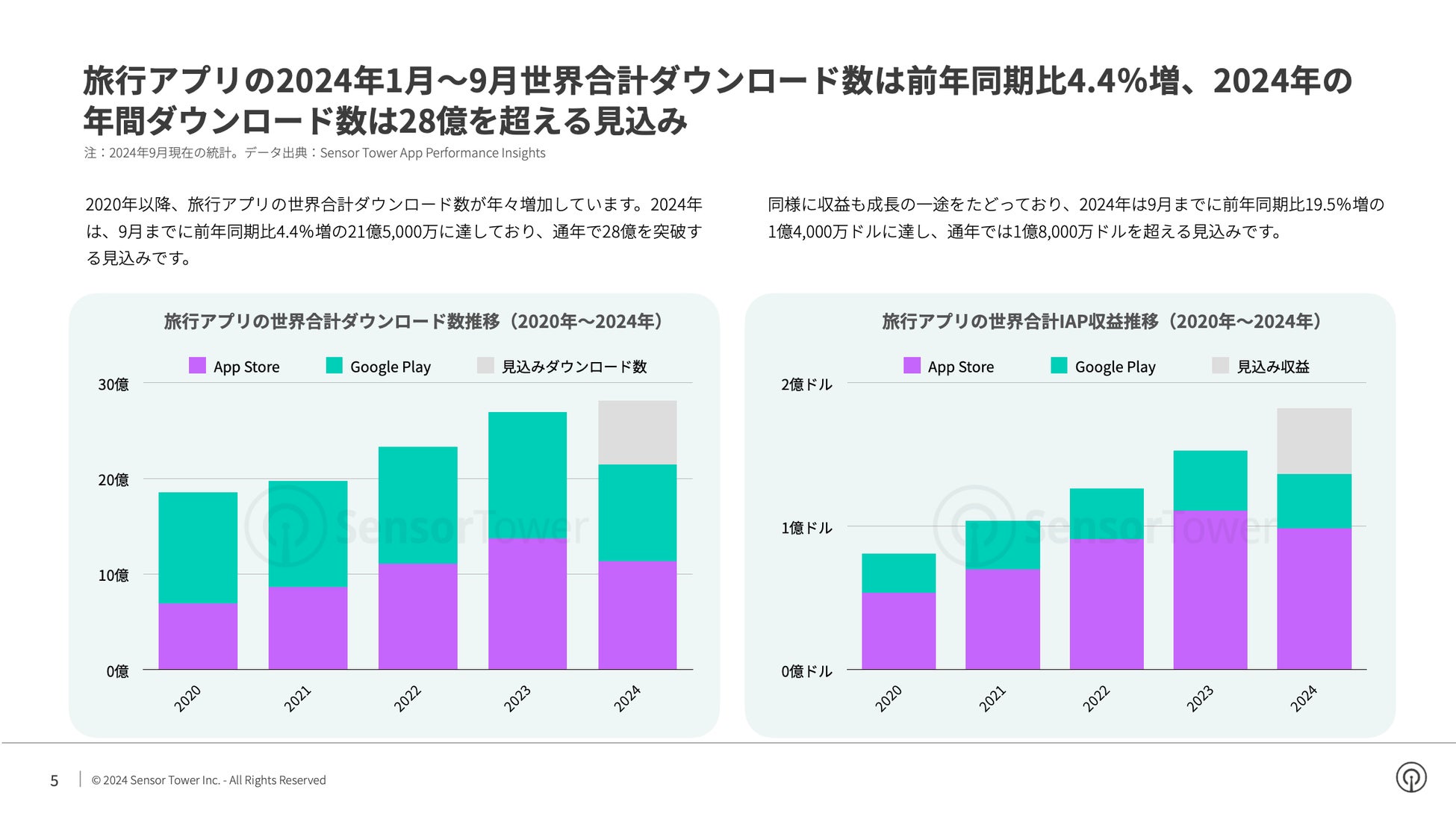 近年、旅行アプリの世界合計ダウンロード数や収益は年々増加しています。2024年は、9月までにダウンロード数が前年同期比4.4%、収益が前年同期比19.5%増加し、通年ではダウンロード数が28億、収益が1億8,000万ドルに達する見込みです。