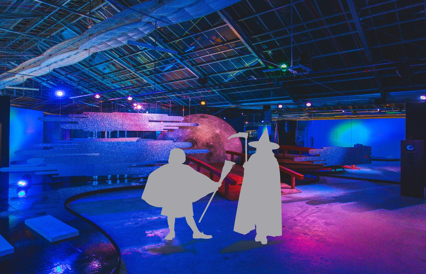 仮装で子どもの頃に戻った気持ちになり、会場内に散りばめられた19個の「光り輝く月マーク探し」を。光り輝く月のマークにチケットや特別アイテム「月の勾玉」をかざすと、月の色に応じた光の演出を味わえます。