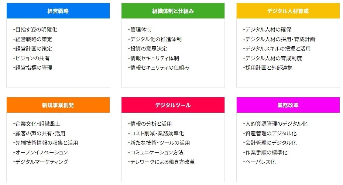 以下の6つの分野でデジタル化の進捗度を可視化することで、将来のデジタル化およびDX推進に向けた戦略の検討を支援します。