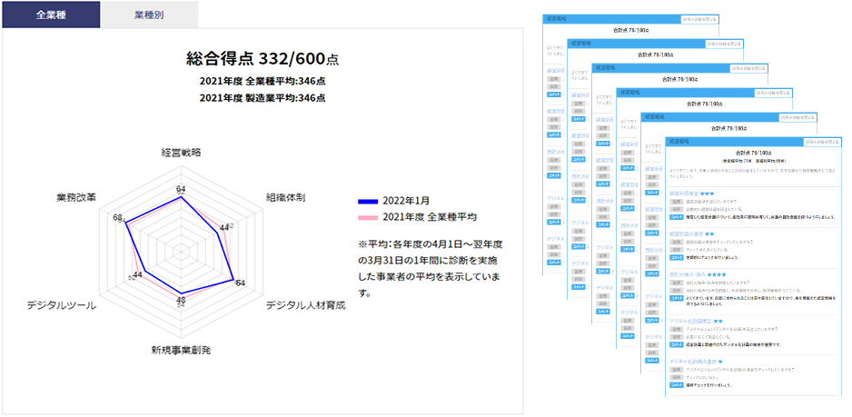 また、自己診断の結果とベンチマークの比較により、自社の優位性や他社とのギャップ、優先的に取り組むべき課題などが明確化されますので、企業変革のために、何から着手すべきか、次のアクションを検討するヒントが見つかります。