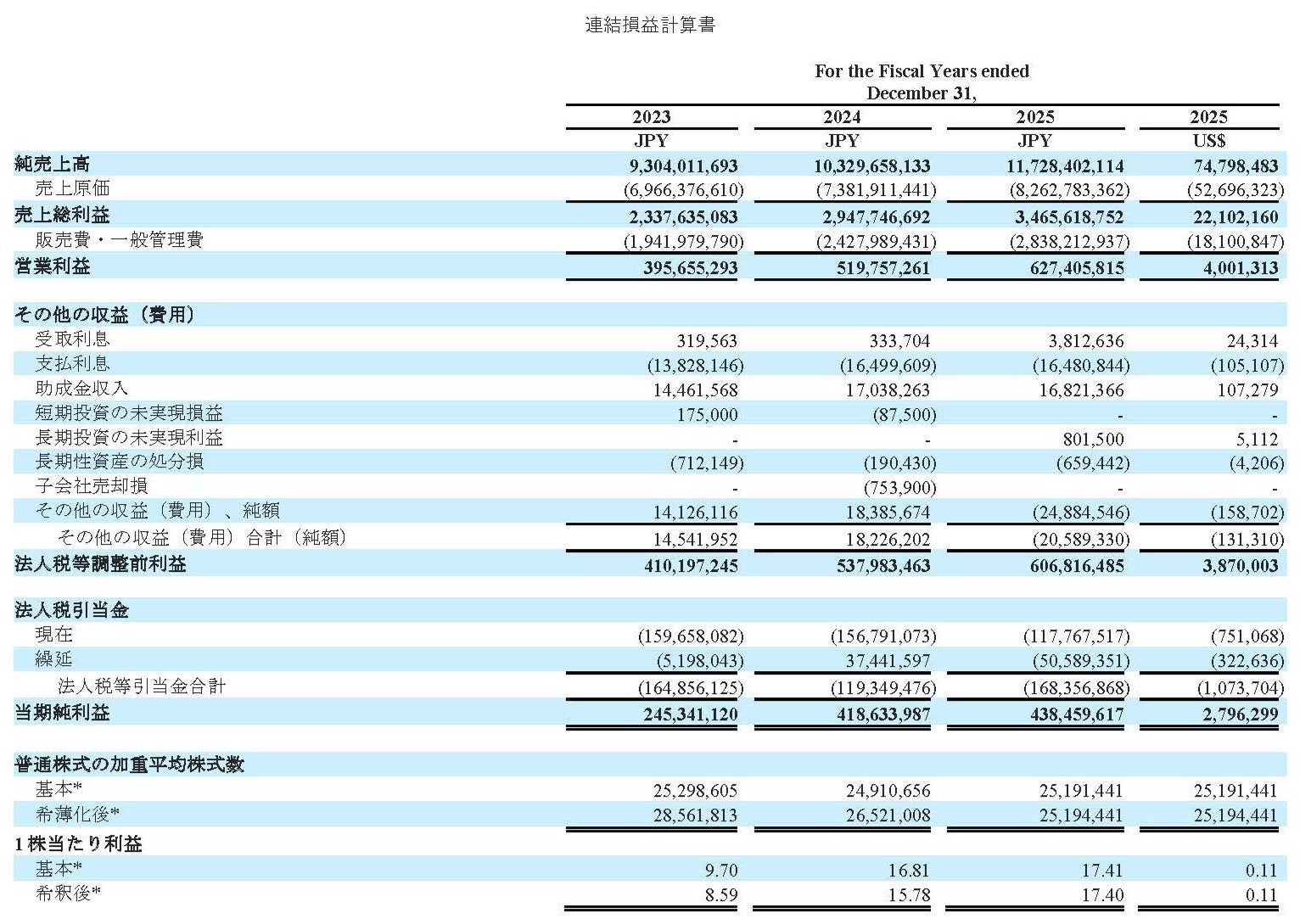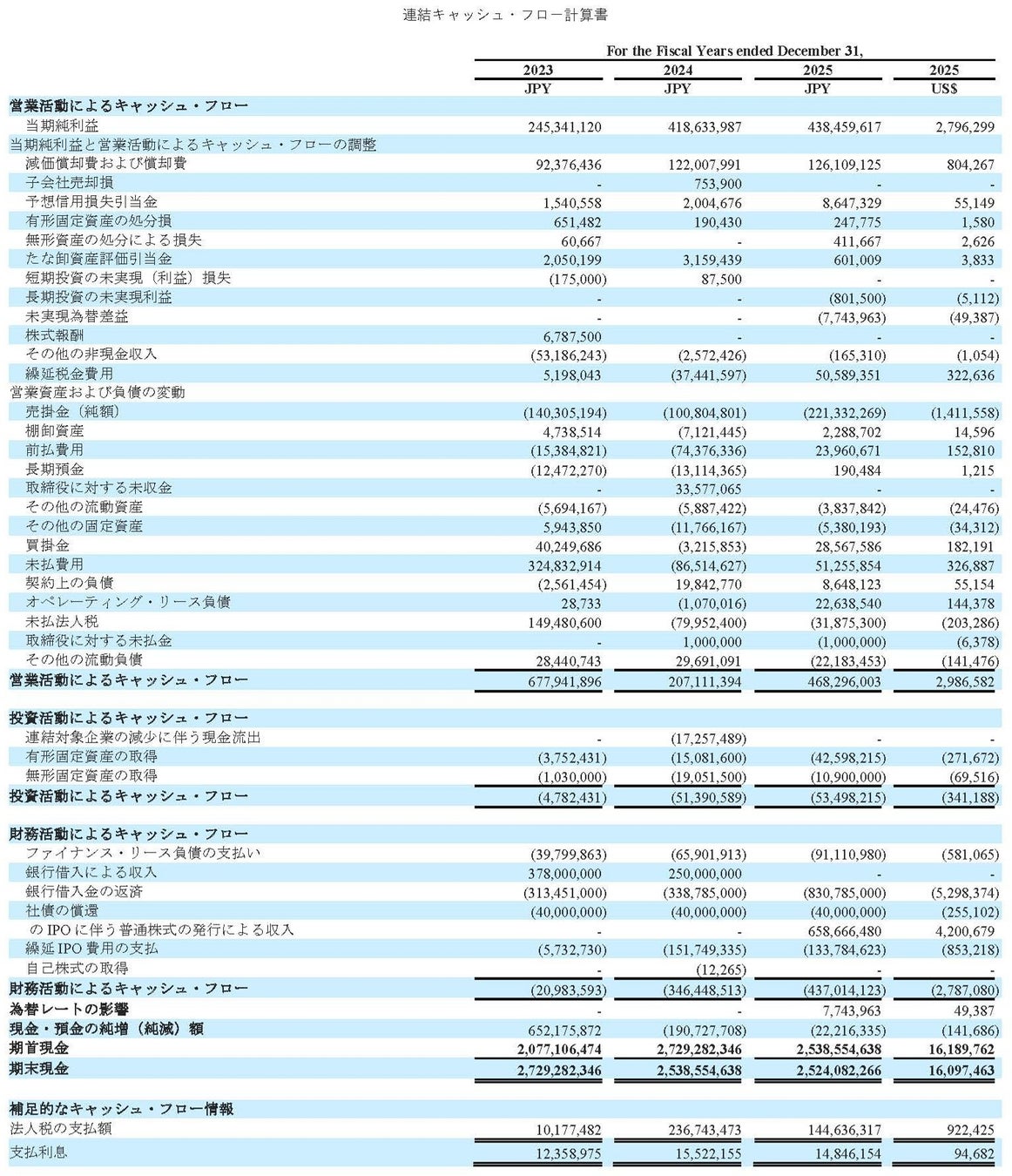「2025年12月期通期において、売上高、営業利益、営業利益率、当期純利益、調整後営業利益、全ての項目において過去最高の業績となりました。セグメント別の業績においては、スポーツスクール事業の売上高前年同期比は7.8%増加、ソーシャル事業の売上高前年同期比は32.8%増加となりました。これらの成果は、国内No.1のシェアを誇るスポーツスクール事業が堅調に成長したことに加え、成長ドライバーである部活動事業の契約数が拡大した結果を反映したものです。特に、当社のソーシャル事業においては、当社がこれまで培ってきた国内No.1の部活動受託実績に加え、2025年度は、大阪府吹田市、東京都渋谷区、北海道紋別市をはじめ、新たな部活動受託契約が増加いたしました。日本政府が進める部活動改革は、学校を基盤とした部活動の運営を地域や民間に移管するものであり、2026年度から2031年度にかけては「改革実行期間」として学校単位から地域・民間への移行が本格的に実行されます。この国策は、当社にとって強力な追い風であり、中長期的な成長の道筋を描くものです。引き続き、日本で培ったスポーツによる非認知能力育成サービスを世界へと発信し、国境を越えて子どもたちの笑顔と成長を支える挑戦を続けてまいりますので、皆様のより一層のご支援を賜りますようお願い申し上げます。」