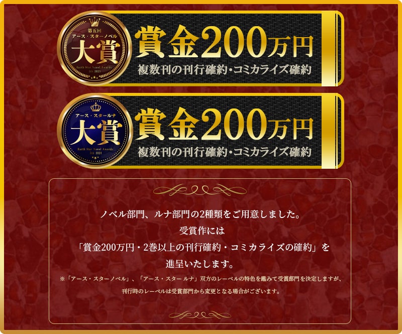 本企画は2022年12月にレーベル創設8周年を迎えた【アース・スターノベル】と2022年6月に創立した新レーベル【アース・スター ルナ】が主催するノベル大賞です。